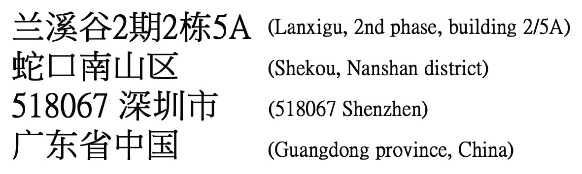 Uns hat die erste Post aus Europa erreicht! Der Brief aus Holland lag überraschend schnell nach nur 12 Tagen in unserem Briefkasten. Also falls Ihr uns auch einen Gruß auf traditionelle Weise übersenden wollt, findet Ihr hier unsere Adresse auf chinesisch. Ohne die chinesischen Schriftzeichen finden uns die Shenzhener Briefträger leider nicht.